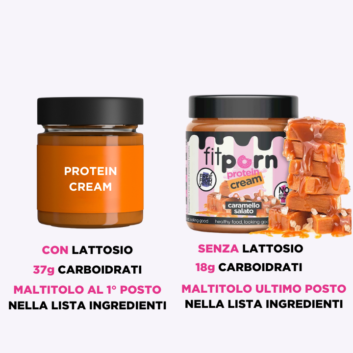 Le Creme Proteiche Fitporn sono le uniche senza lattosio, ricche di proteine, senza zuccheri aggiunti e con il 50% di carboidrati in meno rispetto ad altre creme proteiche.
