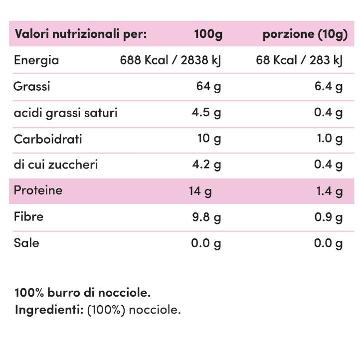 Un solo ingrediente, 100% nocciole Piemontesi GTG purissime, senza aggiunta di sale né zucchero.