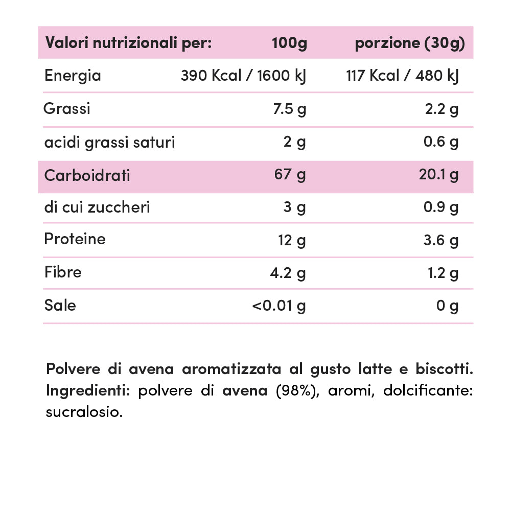 Ingredienti (gusto Caramello Salato) | Polvere di avena (98%), aromi, dolcificante (sucraloso). |