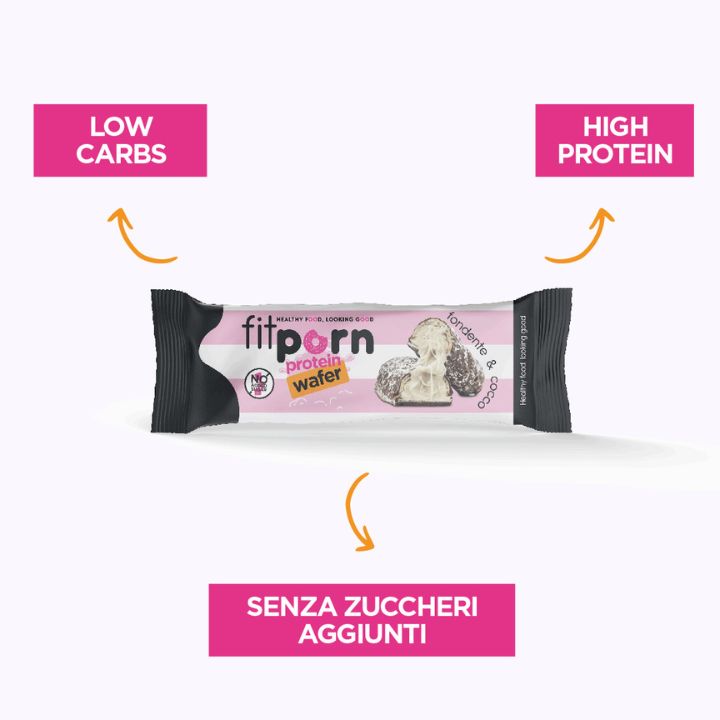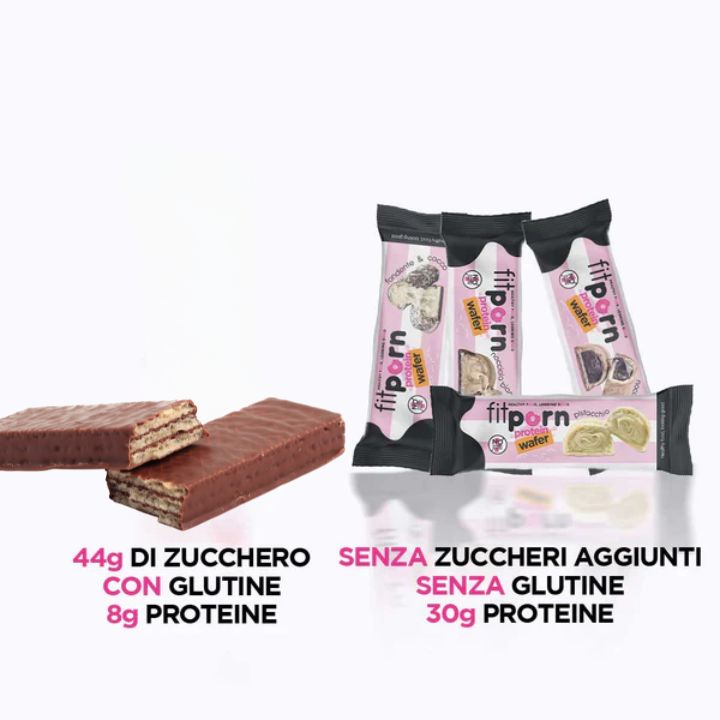 Il Wafer Ripieno Senza Glutine Fitporn è fatto per il 30% di proteine, e viene prodotto senza olio di palma, senza conservanti e senza OGM. Perfettamente compatibile con chi abbraccia una dieta chetogenica.
