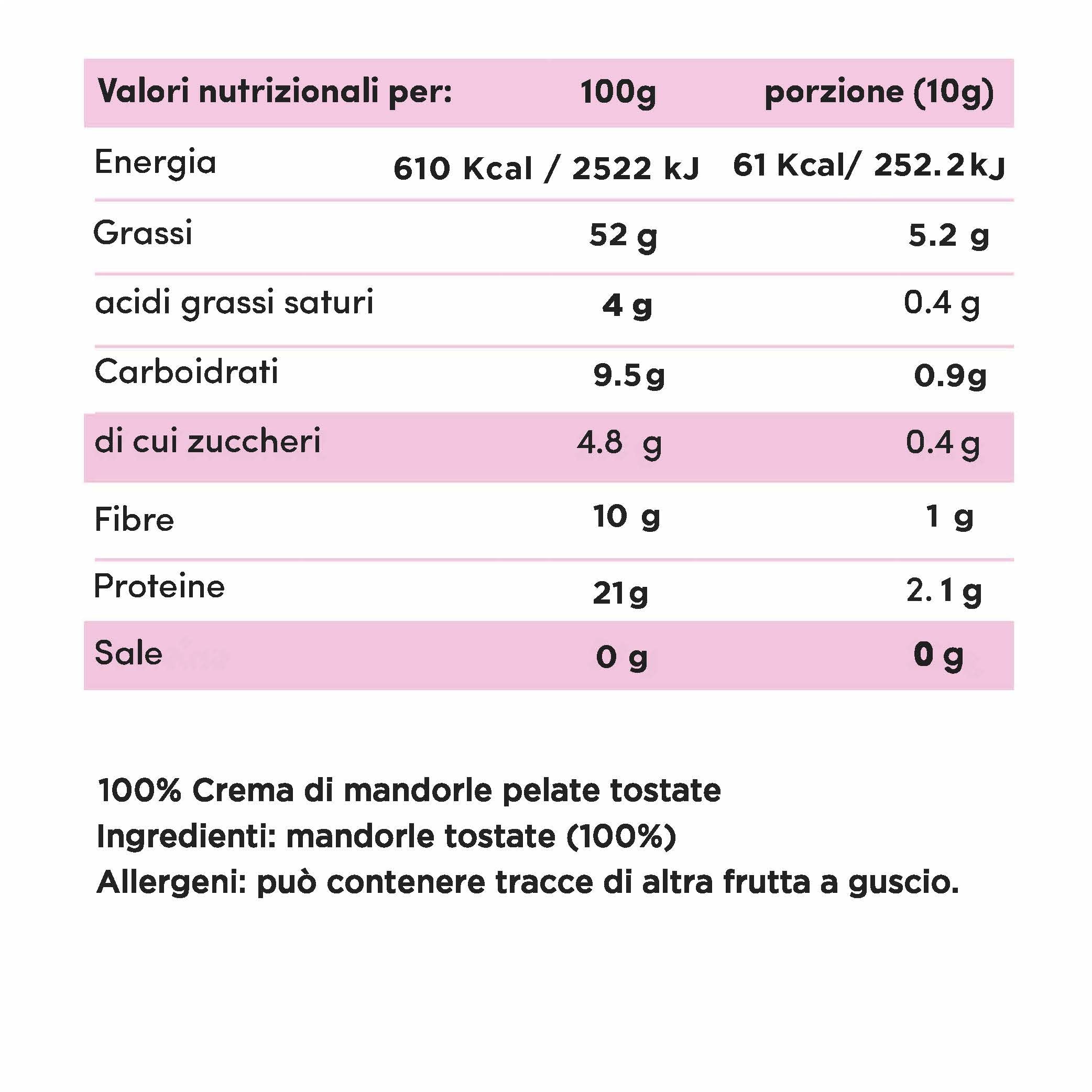 Un solo ingrediente, 100% mandorle pelate tostate purissime, senza aggiunta di sale né zucchero.