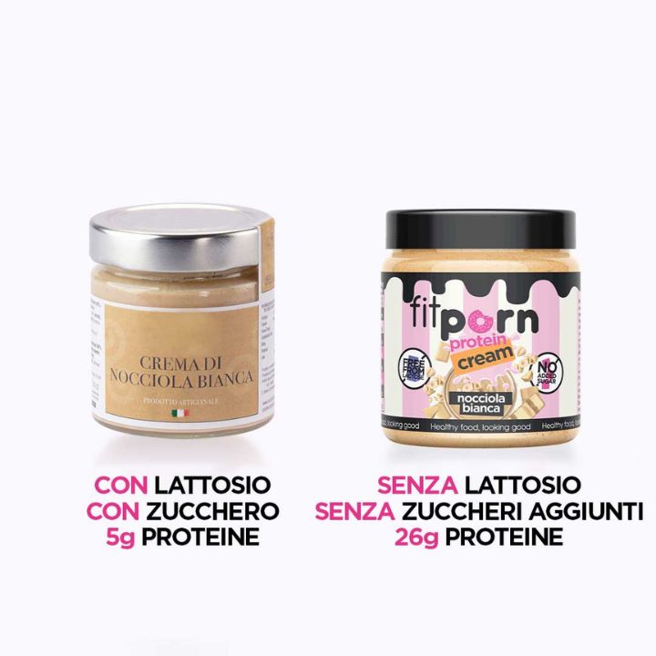 Se sei uno sportivo, segui una dieta ipocalorica, o sei semplicemente una persona attenta alla linea che ama le cose dolci e buone, le creme spalmabili Fitporn sono fatte per te.. sopratutto se sei intollerante al lattosio! La crema proteica alla nocciola bianca Fitporn è stata creata per regalarti quei momenti di dolcezza che ci fa tanto bene concederci ogni tanto… ma senza rimorsi e sensi di colpa!